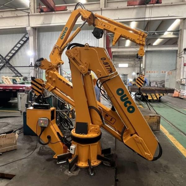 These two 0.8T7M Hydraulic Knuckle and Foldable Boom Cranes are customized for domestic customers to be installed on fishing vessels, assisting in aquaculture and breeding industries. With a working radius of 2-7 meters and a safe working load of 0.8 tons, they are designed to meet the specific needs of these sectors.